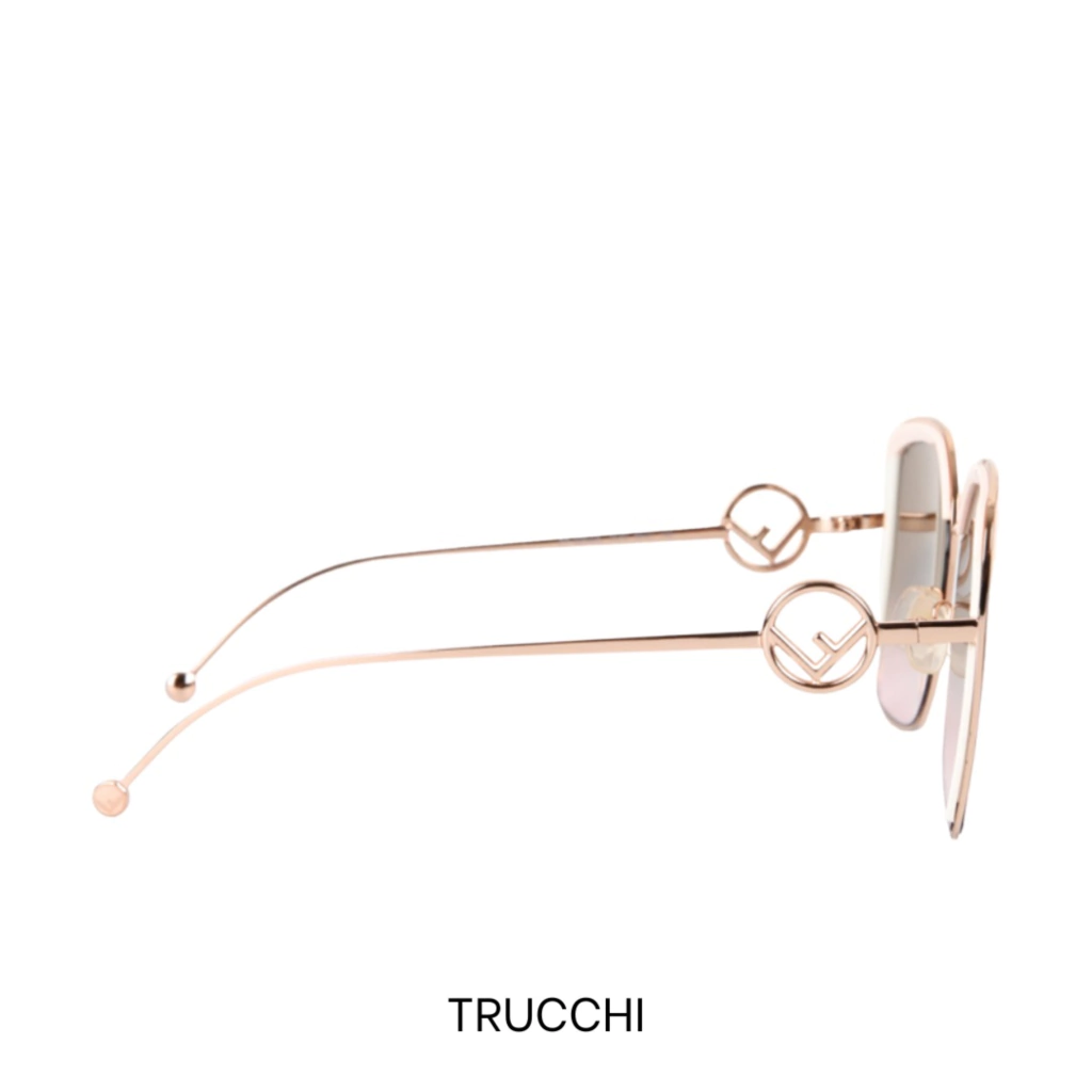 Óculos Solar Fendi, confeccionado em metal e acetato. O modelo possui lentes amplas quadradas na cor marrom em degradê com toque espelhado, ferragens na cor dourada, e detalhe em esmaltação no entorno das lentes nas cores rosa claro e creme. Apresenta um círculo com o logo da marca nas hastes.